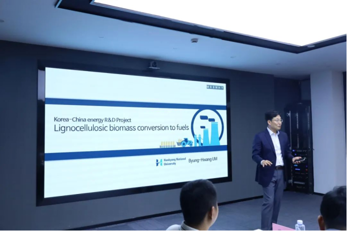 會上,中韓兩國專家學者圍繞農林固廢碳化處理與資源化技術、植物在鹽堿地的生物修復、生物炭材料在土壤修復中的利用、以及海洋垃圾的收集與資源化能源化處理技術等內容進行分享。嚴秉煥教授分享了其在草本生物質資源化利用、可降解塑料和鹽堿土壤修復方面的研究成果;寇巍對他帶領的科研團隊在生物質好氧、厭氧、熱化學轉化、碳捕集等課題研究作分享與交流;晉均夏介紹了韓國E-city公司的整體情況及公司在生物質半炭化技術與應用、鈉鉀鹽結焦問題的處理等方面的研究及項目情況;周巖以沼氣工程為起點介紹了環保、生物質等行業市場、技術,并提出了可能的研究項目及設備;金榮溒介紹了其新研發的低溫朗肯循環、地熱利用等的進展情況。各位專家的報告高屋建瓴,極具前瞻性、理論性和實踐性,帶來一場豐富的學術盛宴。