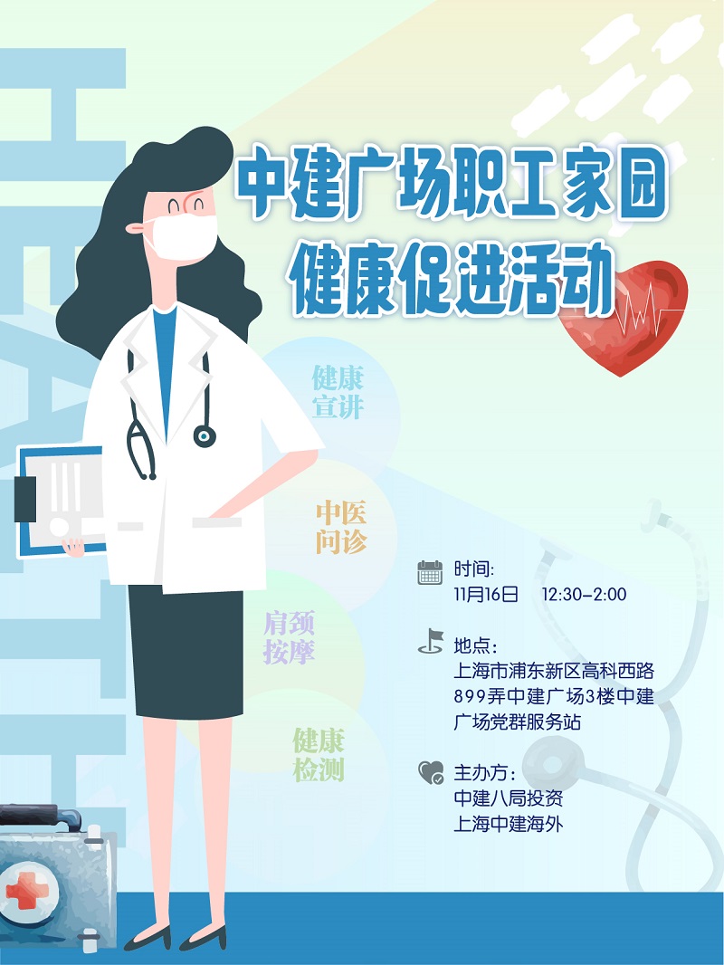 為深入開展 “我為群眾辦實事”實踐活動,中建八局投資公司以職工需求為導向,著力解決職工關注的健康問題。11月16日,公司工會聯合上海中建海外公司工會在上海中建廣場黨群服務中心舉辦職工家園健康促進活動,廣場各單位共計40余名職工參加活動。