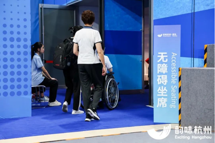 提示盲道增設在,運動員出入口、電梯口等特定地點,方便運動員們知道自己的位置,比賽出發臺邊增設無障礙平臺,以便運動員們不費力地,從熱身池直接到達出發點,賽場邊,結合場地特點,新增了23個無障礙坐席,對更衣室和電線線槽也做了優化調整
