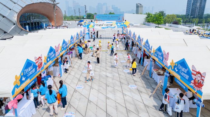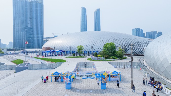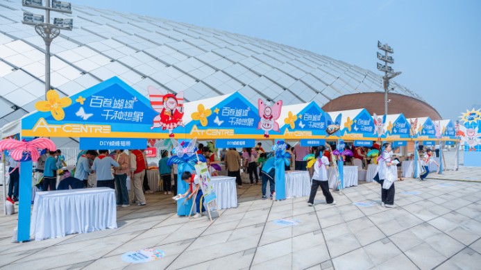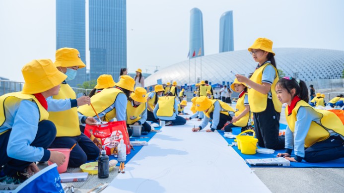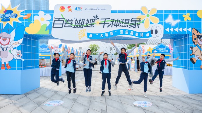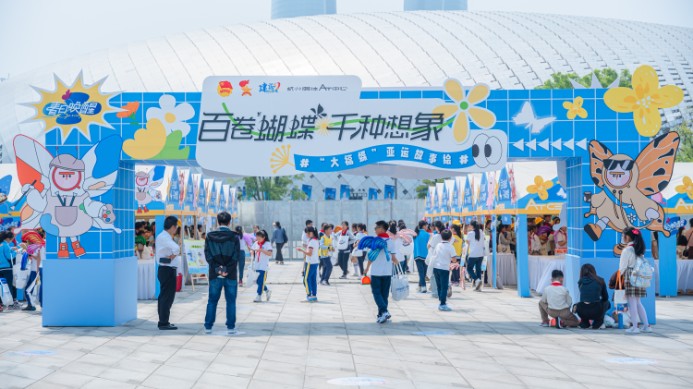 活動現場,少先隊員們在集市活動中體驗傳統的以“福蝶”為主題的非遺面塑、非遺版畫拓印和創意手繪、面部彩繪等項目。由本次亞運主題繪畫的獲獎作者和蕭山區少先隊員代表以亞運和奧體中心體育游泳館結合為元素創作主題繪畫,在絢爛的畫布上既多元展現“大福蝶”后亞運新顏,也再次傳遞堅強不屈的亞運精神。