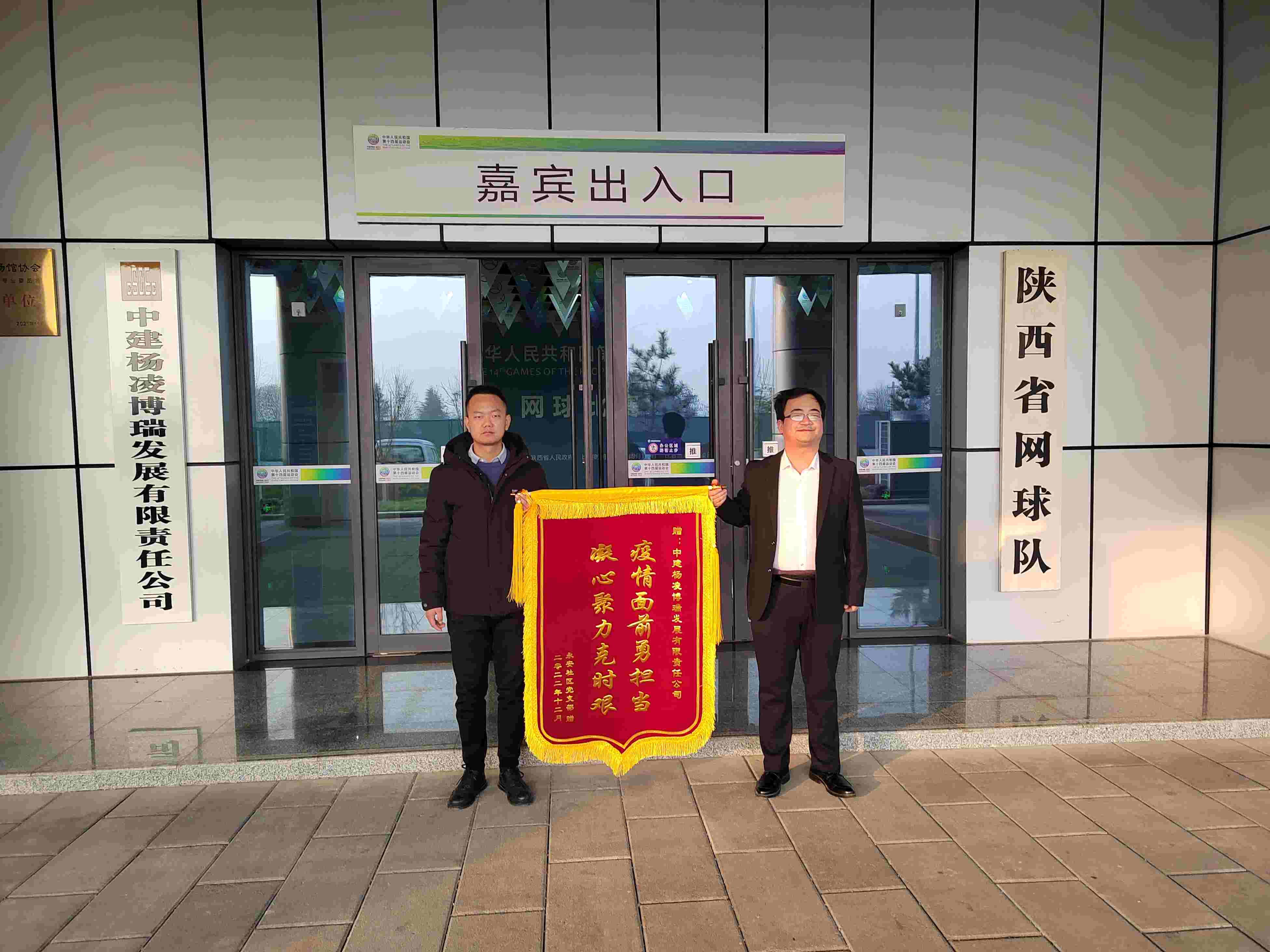 12月9日,楊凌示范區永安社區黨支部書記吳云蛟將一面印有“疫情面前勇擔當 凝心聚力克時艱”的錦旗交到了楊凌網球項目公司物業管理部何應釗的手中。
