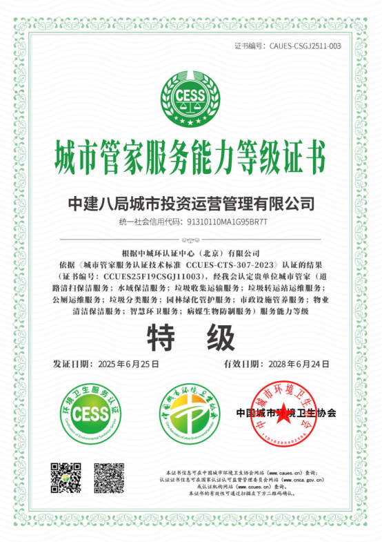 近日,中建八局城市投資運(yùn)營管理有限公司獲中國城市環(huán)境衛(wèi)生協(xié)會特級認(rèn)證